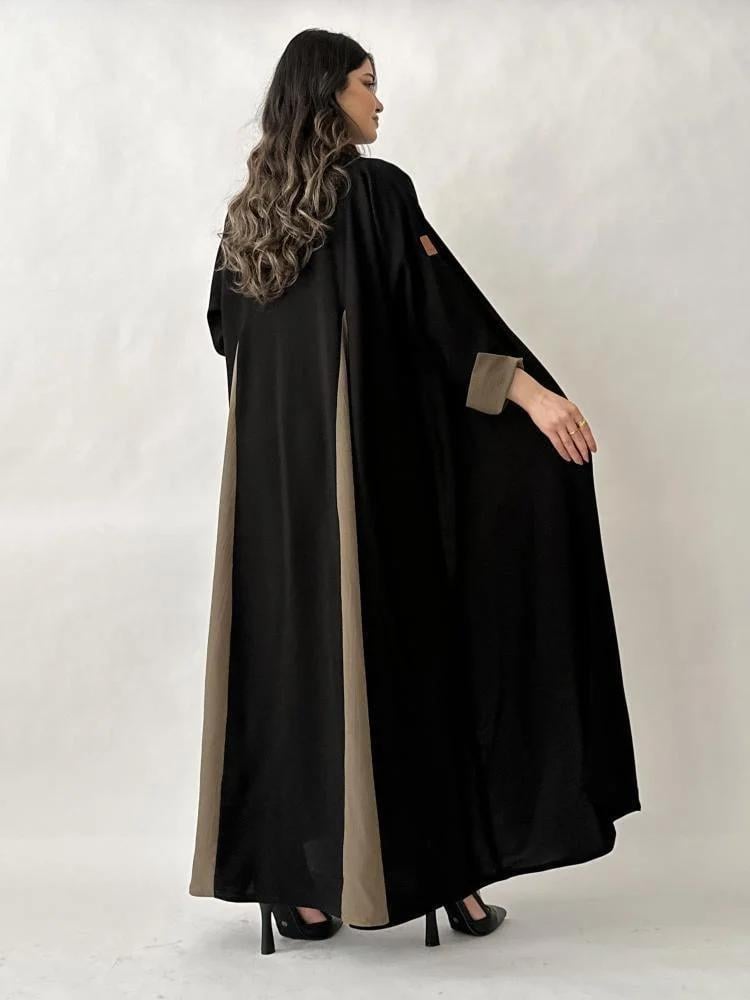 - عباية شذى تتميز بتدخيلات من قماش الكريب الملون بالجملي على ظهر العباية مما يعطي لمسة احترافية ناعمة تناسب الأجواء الرسمية.