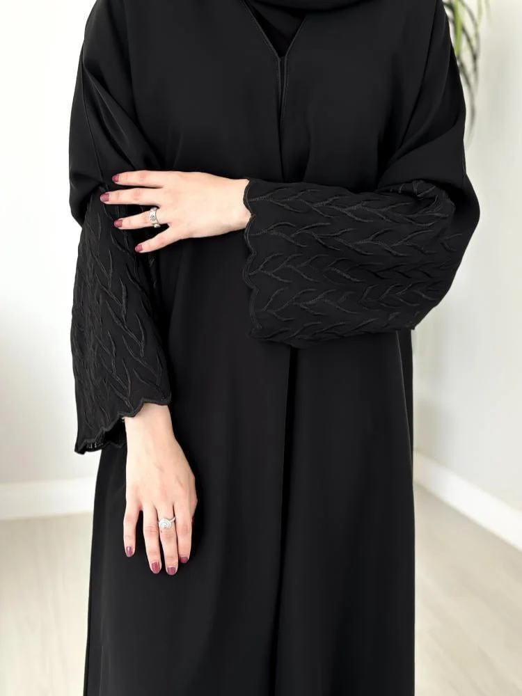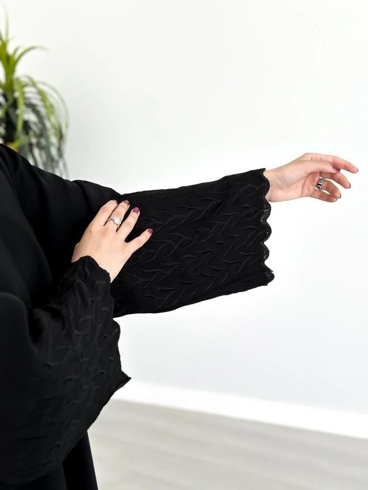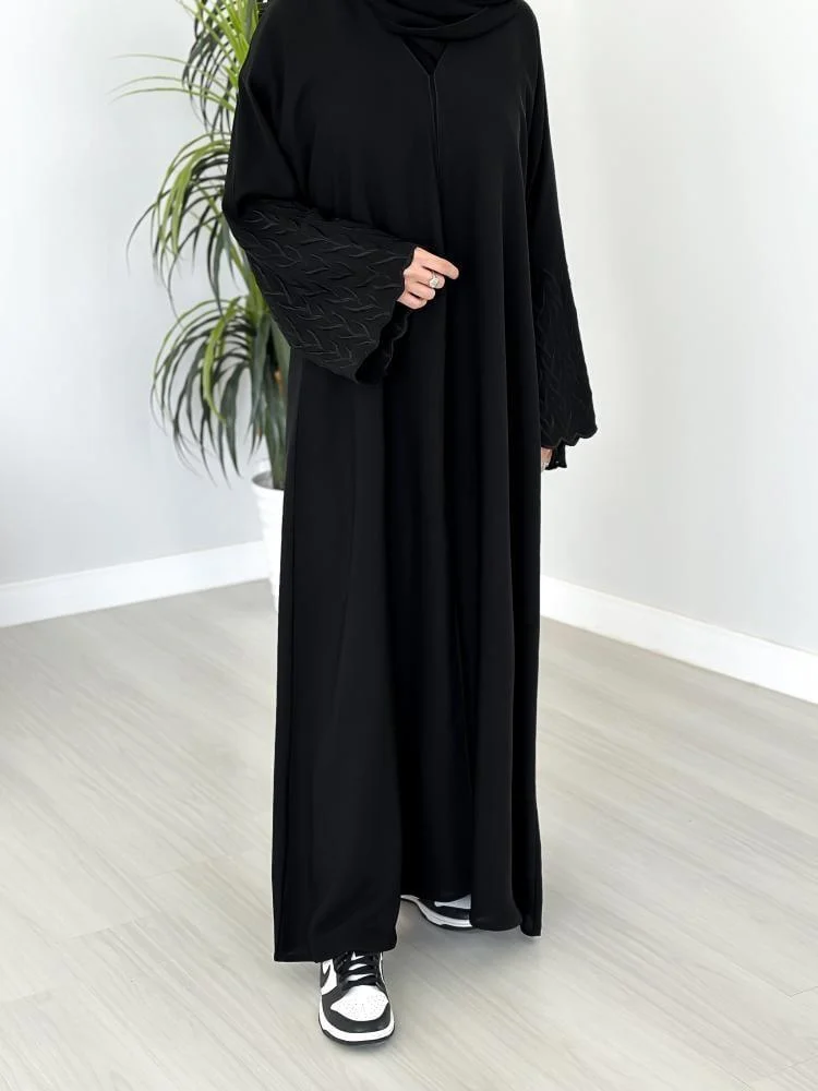 - تأتي العباية مزينة بتطريزات دقيقة من علي الأكمام مما يضفي عليها طابعا أنثويا راقيا.